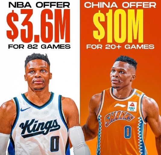 CBA的外援工資帽是425萬(wàn)美元,如果給威少開出1000-1400萬(wàn)美元的半賽季合同,意味著需要繳納巨額奢侈稅,也意味著引進(jìn)威少球隊(duì)就需要花費(fèi)將近3000萬(wàn)美元。