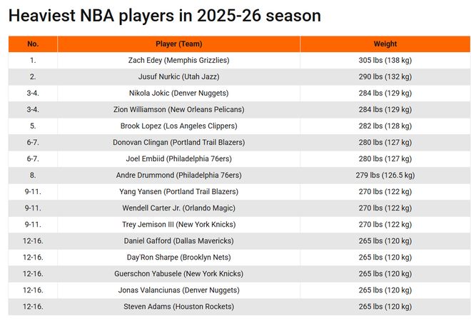 在這份榜單中,灰熊的扎克·埃迪以138公斤排名聯(lián)盟第一,爵士的努爾基奇132公斤緊隨其后。減重后的錫安與約基奇都是129公斤,并列排名第三??齑拇舐?、開拓者的克林根、76人的恩比德和德拉蒙德分列第4到第8位。