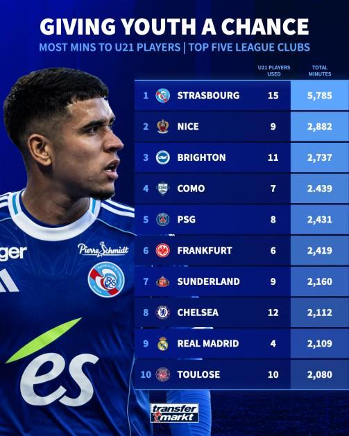 北京時間10月16日,德轉(zhuǎn)統(tǒng)計出了本賽季至今歐洲五大聯(lián)賽俱樂部U21球員的出場時間排行榜,斯特拉斯堡15名球員共計出場5785分鐘高居第一,巴黎圣日耳曼、切爾西以及皇家馬德里也都進入前10位。