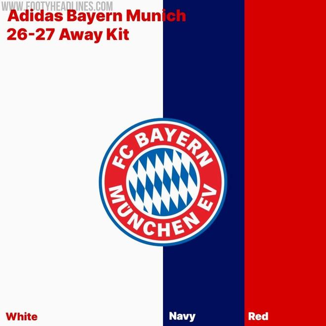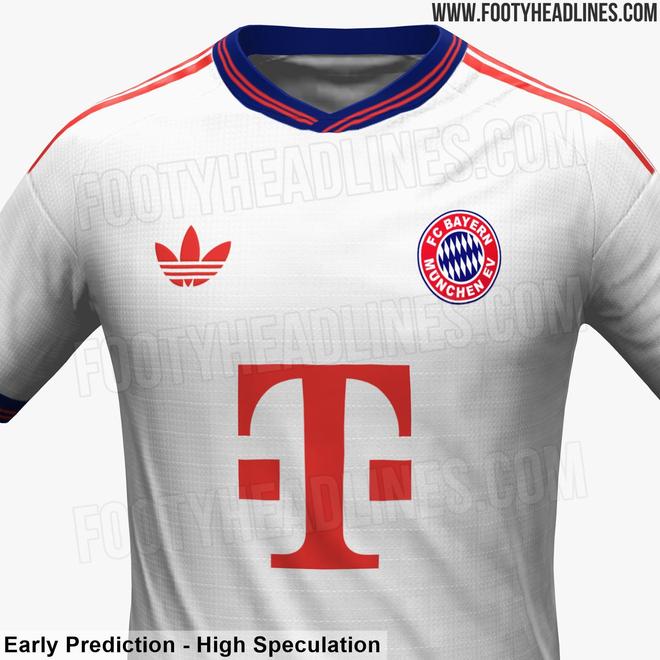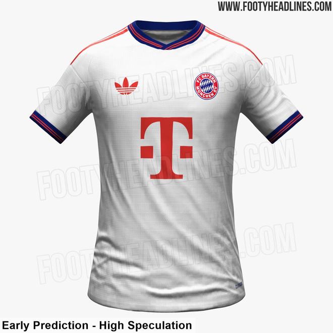 拜仁慕尼黑2026/27賽季客場球衣以白色為主色調,與2025/26賽季客場球衣的主色保持一致,配色預計為海軍藍和紅色。