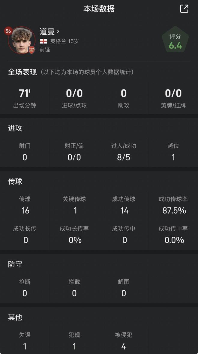 雷速體育10月30日訊 英聯(lián)杯第四輪,阿森納在主場以2-0的比分淘汰布萊頓。5歲小將道曼表現(xiàn)搶眼,全場貢獻5次成功過人,傳球成功率高達87.5%。